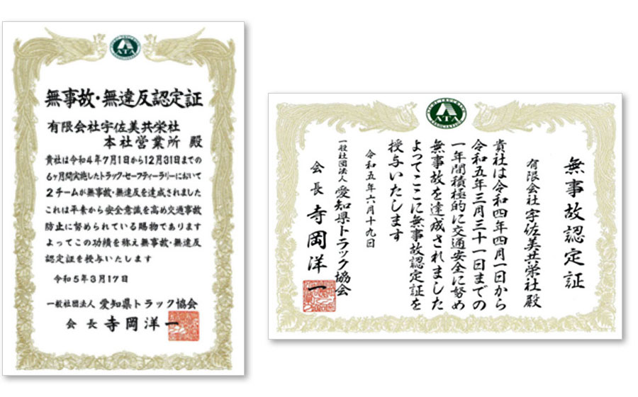 優良事業所として運輸関連法を遵守し、従業員一丸となって事故削減に努めております。